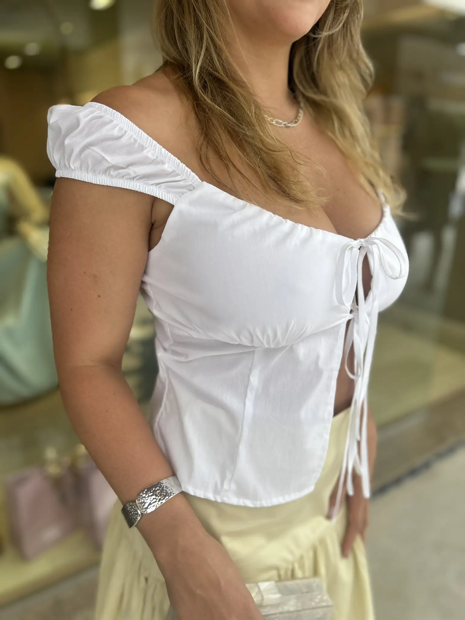 Blusa modelo bata no algodão com detalhe de laços no decote