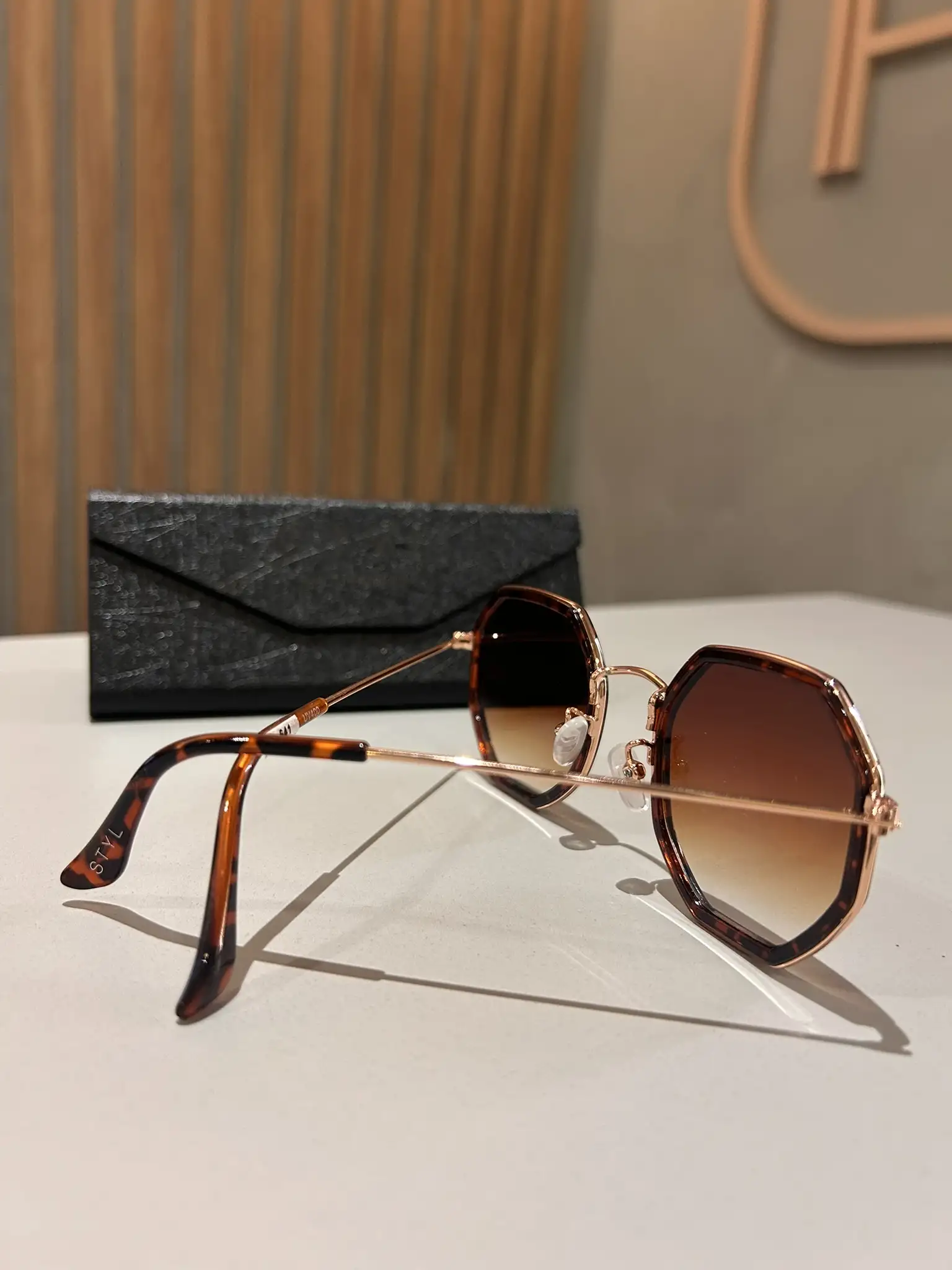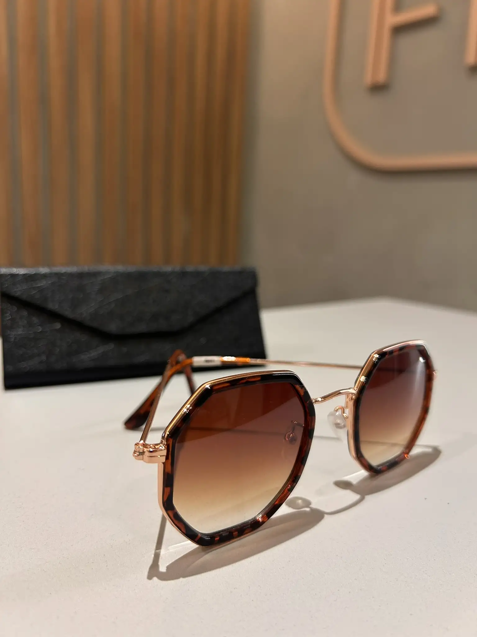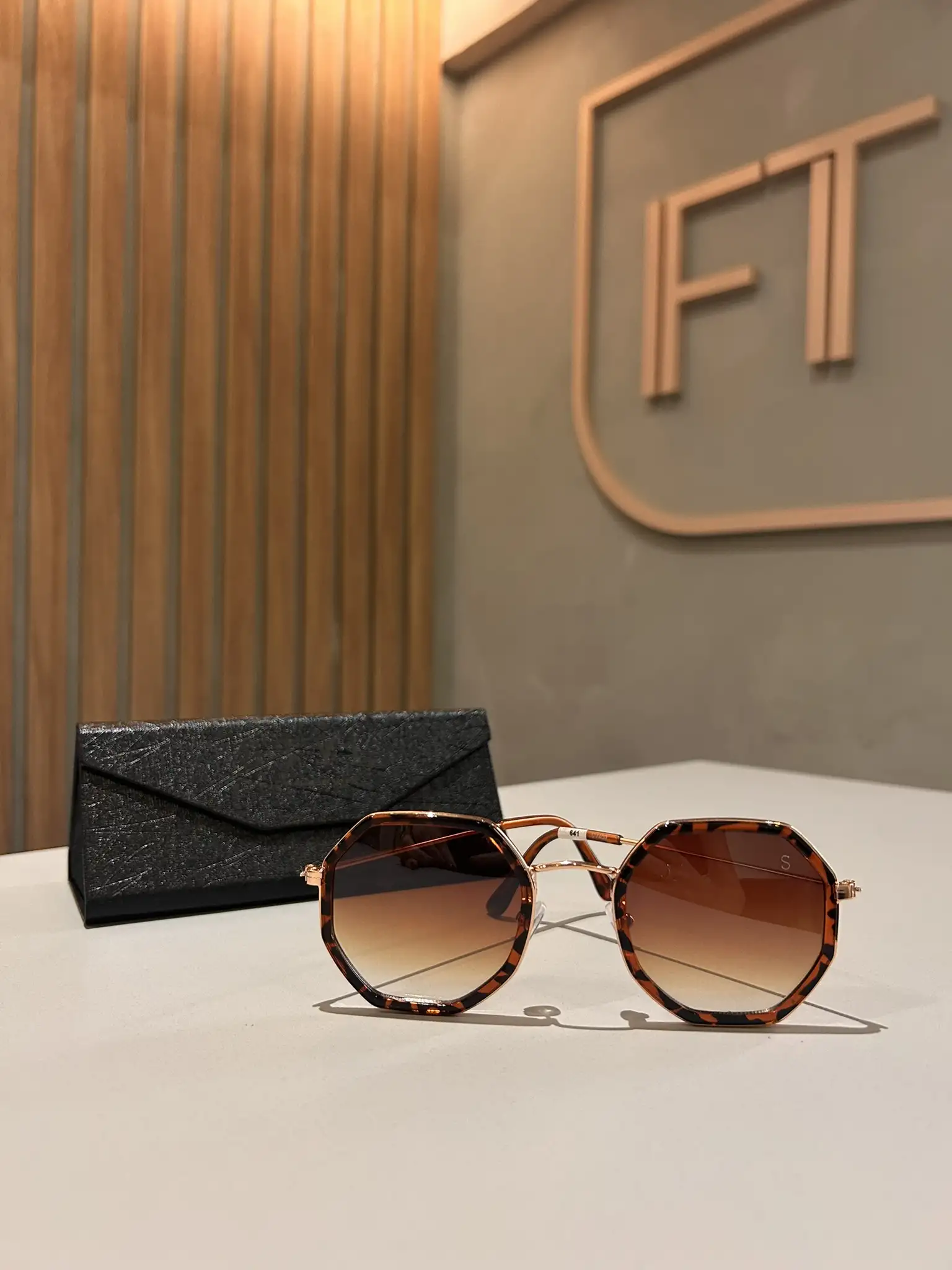 No marrom com detalhe tartaruga, lente degradê e metal rosê de alta qualidade.