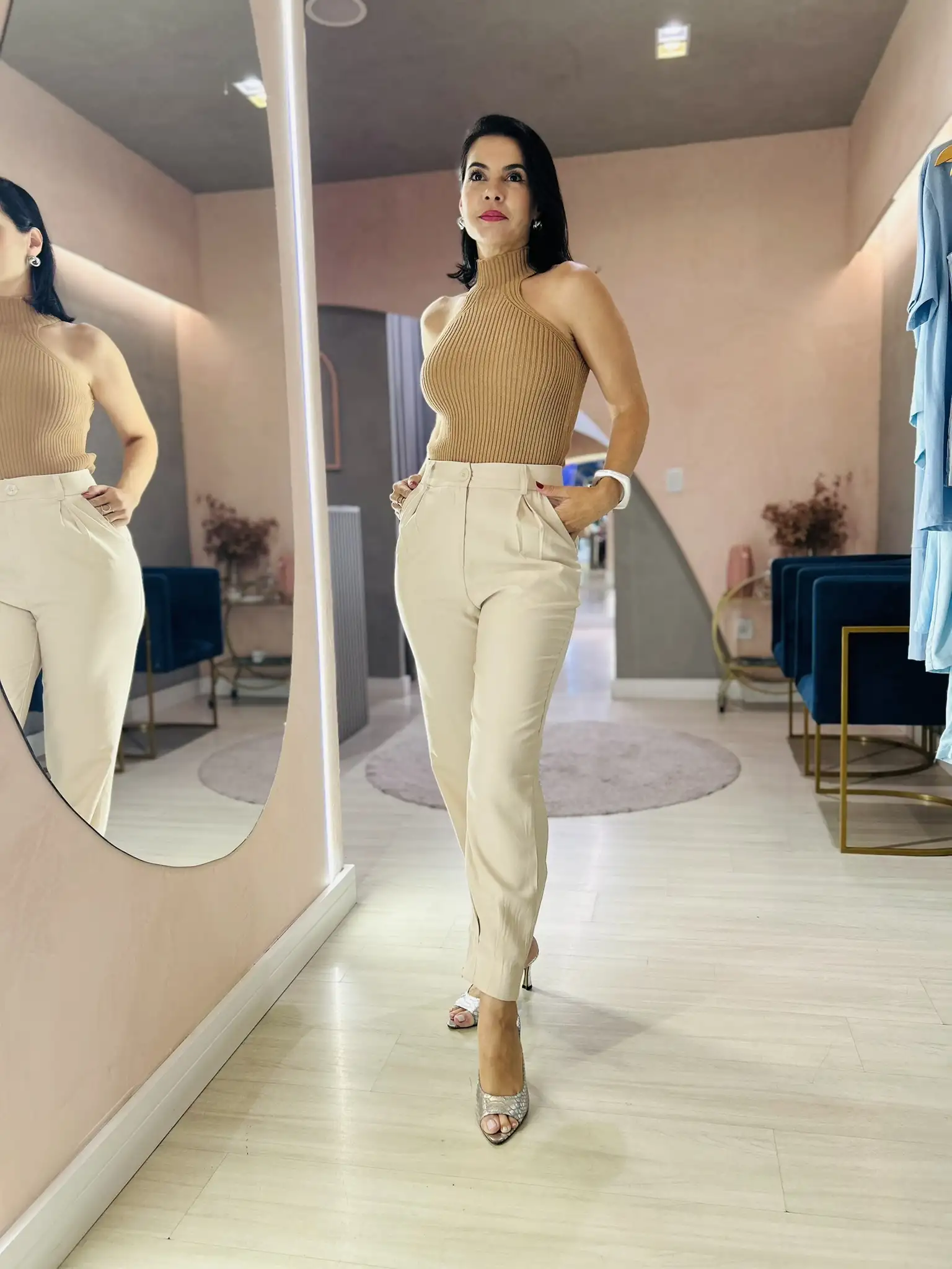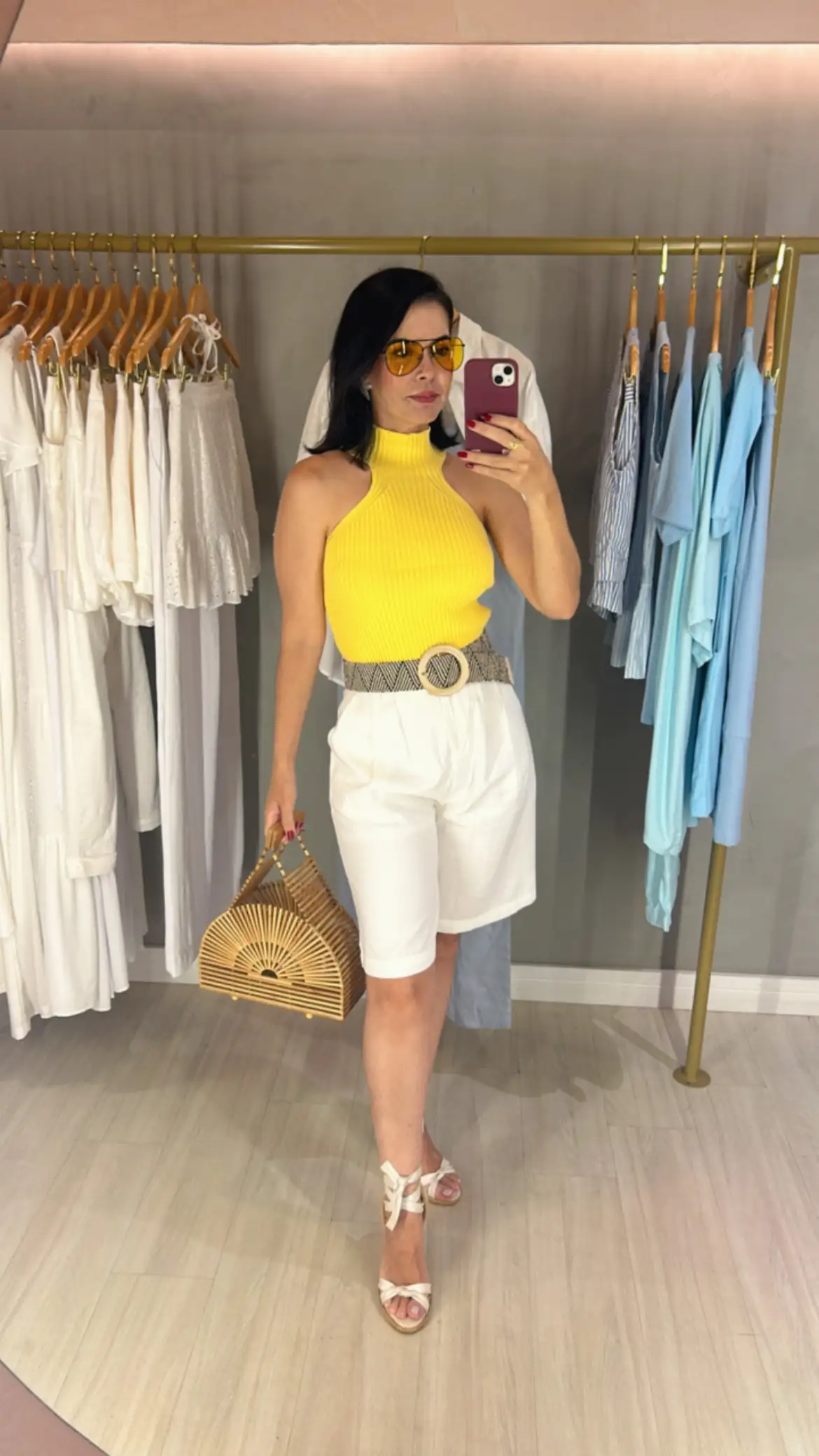 Essa regata tem o recorte do decote como seu diferencial... A cava do ombro é grande e a gola garrafa alonha a silhueta.